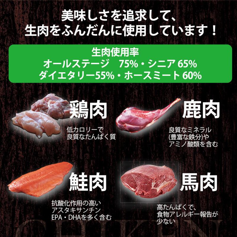 高タンパクの良質な馬肉を60%も使用。チキン・小麦を不使用とし低アレルゲンタイプに仕上げました。野菜粉末、各種酵母、乳酸菌、オリゴ糖2種を配合し、おなかの健康維持をサポート。