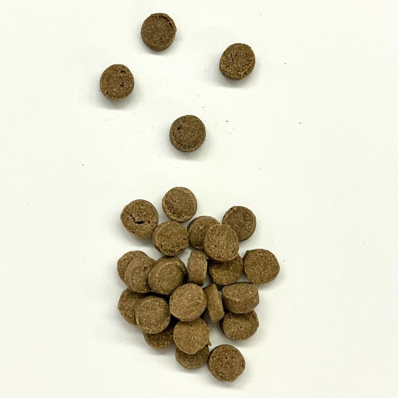 素材:鯨肉、大麦、青玄米、かつお節、なたね油、ブロッコリー、小松菜、ワカメ、ひじき、粟、ビール酵母、卵殻カルシウム、FK-23濃縮乳酸菌