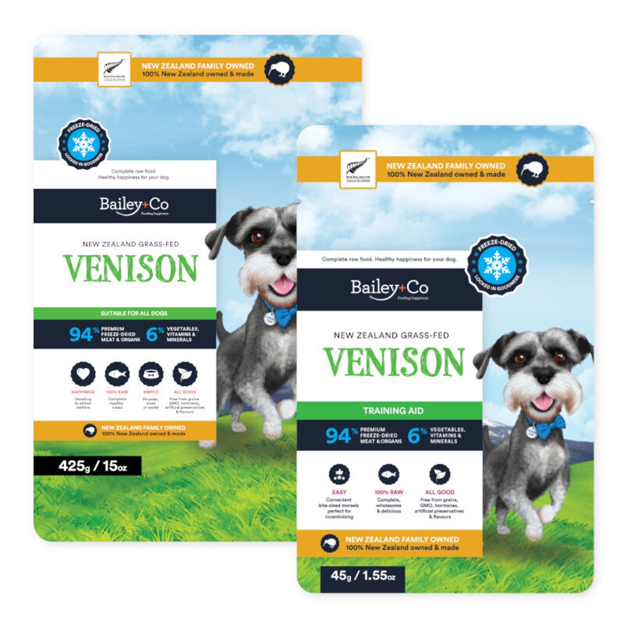 フリーズドライで手間がかからず主食として、またBailey+Co ボーンブロスと混ぜたり、トッピングとして与えたりするだけで、愛犬に毎日の幸せを与えられます。