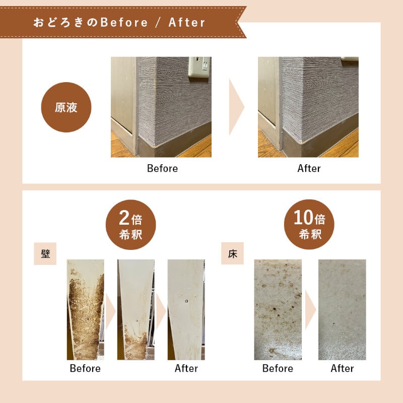 ペットとの生活の悩みの中でも上位に当たる「汚れ」「ニオイ」。毎日思いっきり掃除をしたいですよね!どんなに汚れ落ちが良くても価格が高いと上記の悩みは解決されません・・。そこでキャッテリー フレッシュは10倍希釈で1本240円と、使いやすい価格設定に致しました!多頭飼いのお家でもじゃぶじゃぶ使用していただけます。