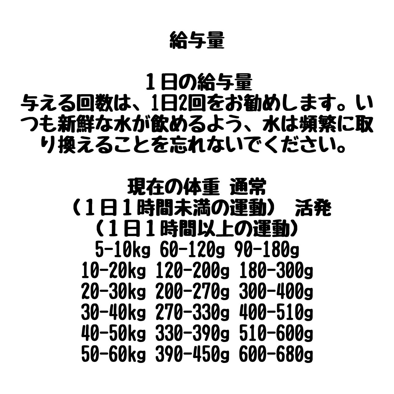 カルシウム/リン 1.5%以上/ 1.1%以上、オメガ6/オメガ3 2.2%以上/ 0.8%以上、DHA/EPA 0.15%以上/ 0.15%以上 カロリー配分 代謝エネルギーは3325kcal/kg(250 ml カップ1杯につき399kcal)、うち35%がたんぱく質、36%が脂肪、29%がフルーツ、野菜由来。
