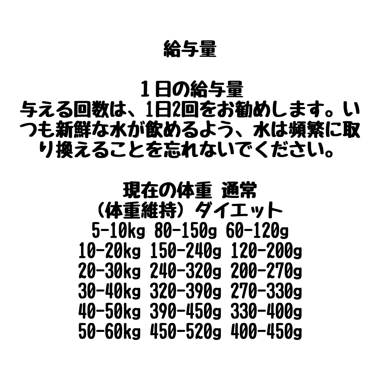 カルシウム/リン 1.4%以上/ 1.0%以上、オメガ6/オメガ3 2.2%以上/ 0.4%以上、DHA/EPA 0.1%以上/ 0.1%以上 カロリー配分 代謝エネルギーは3070kcal/kg(250 ml カップ1杯につき368kcal)、うち40%がたんぱく質、30%が脂肪、30%がフルーツ、野菜由来。