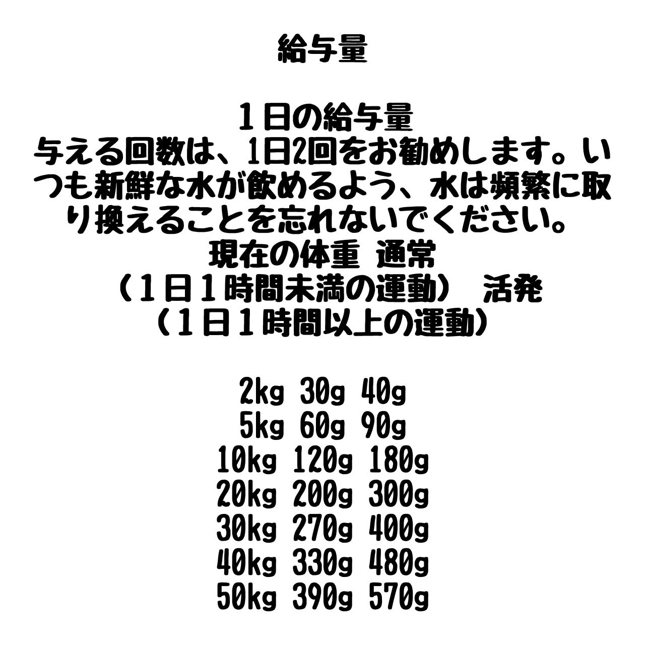 "カルシウム / リン 1.5%以上 / 1.1%以上、オメガ 6 / オメガ 3 1.8%以上 / 0.8%以上、DHA/EPA 0.15%以上/ 0.1%以上 代謝エネルギー3393kcal/kg(250 ml カップ1杯につき407kcal)