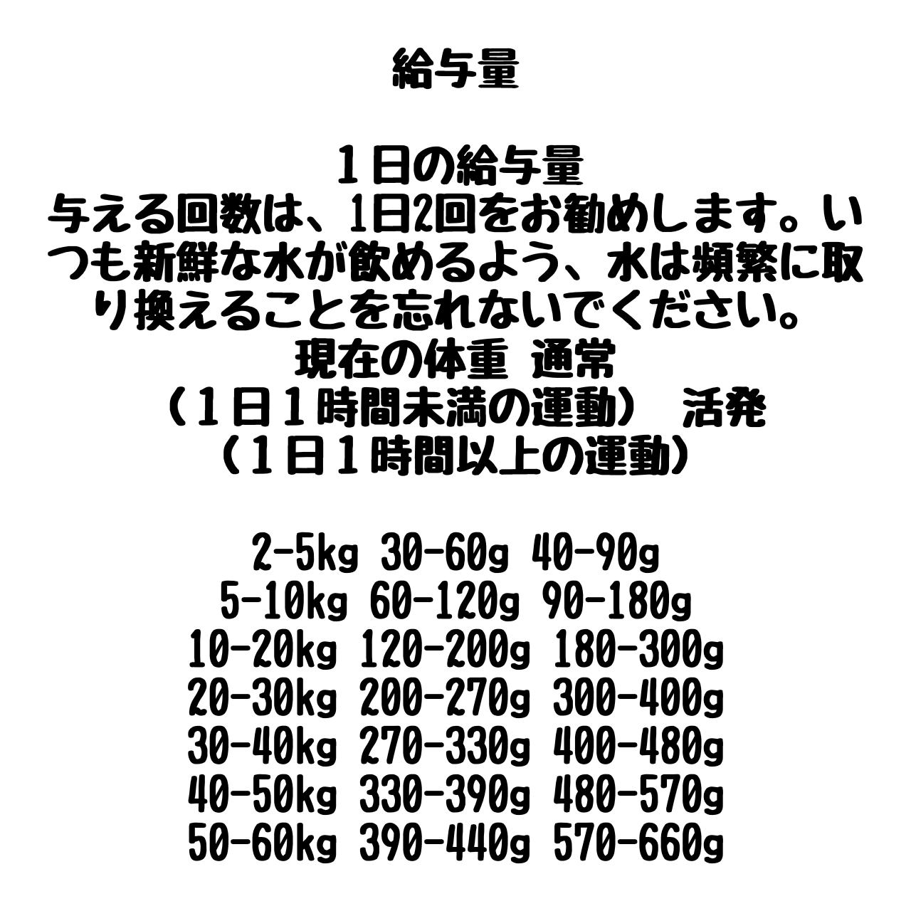 カルシウム / リン 1.3%以上 /0.9%以上 オメガ 6 / オメガ 3 2.2%以上 / 0.8%以上、DHA/EPA 0.15%/0.10% カロリー配分 代謝エネルギーは3393kcal/kg(250 ml カップ1杯につき407kcal)、うち32%がたんぱく質、38%が脂肪、30%がフルーツ、野菜由来。