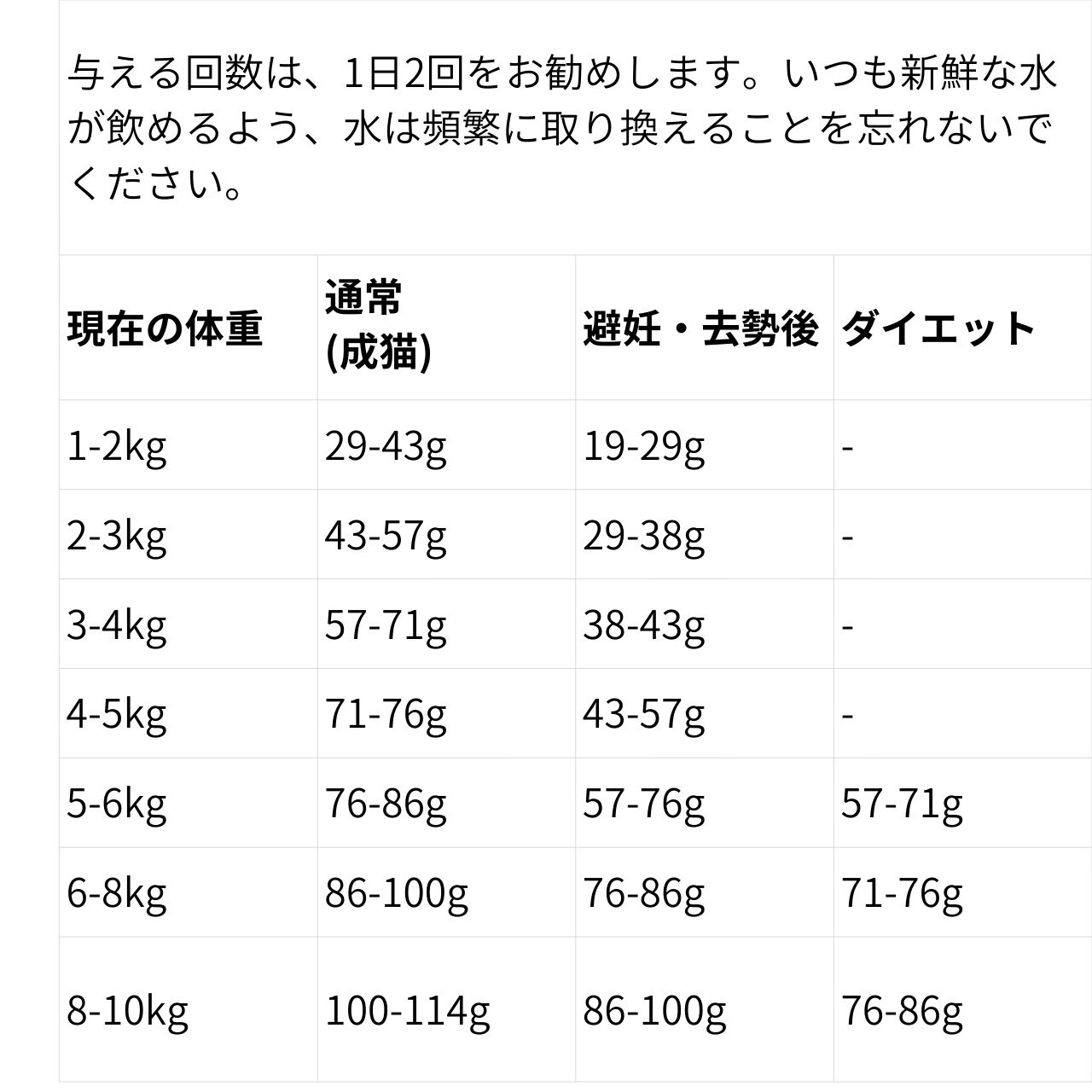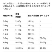 "カルシウム/ リン 1.5%以上/ 1.2%以上、オメガ6/ オメガ3 2.8%以上/ 0.5%以上、DHA/ EPA 0.15%/ 0.15%、タウリン 0.1%以上、マグネシウム 0.1%以上 カロリー配分 代謝エネルギーは3760kcal/kg(250 ml カップ1杯につき429kcal)、うち36%がたんぱく質、36%が脂肪、28%が炭水化物由来。