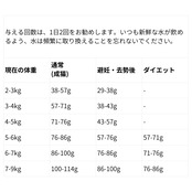 カルシウム/ リン 1.3%以上/ 1.0%以上、オメガ6/ オメガ3 2.0%以上 / 0.5%以上、DHA/ EPA 0.2%/ 0.1%、タウリン 0.1%以上、マグネシウム 0.1%以上 カロリー配分 代謝エネルギーは3630kcal/kg(250 ml カップ1杯につき414kcal)、うち38%がたんぱく質、40%が脂肪、22%が炭水化物由来。