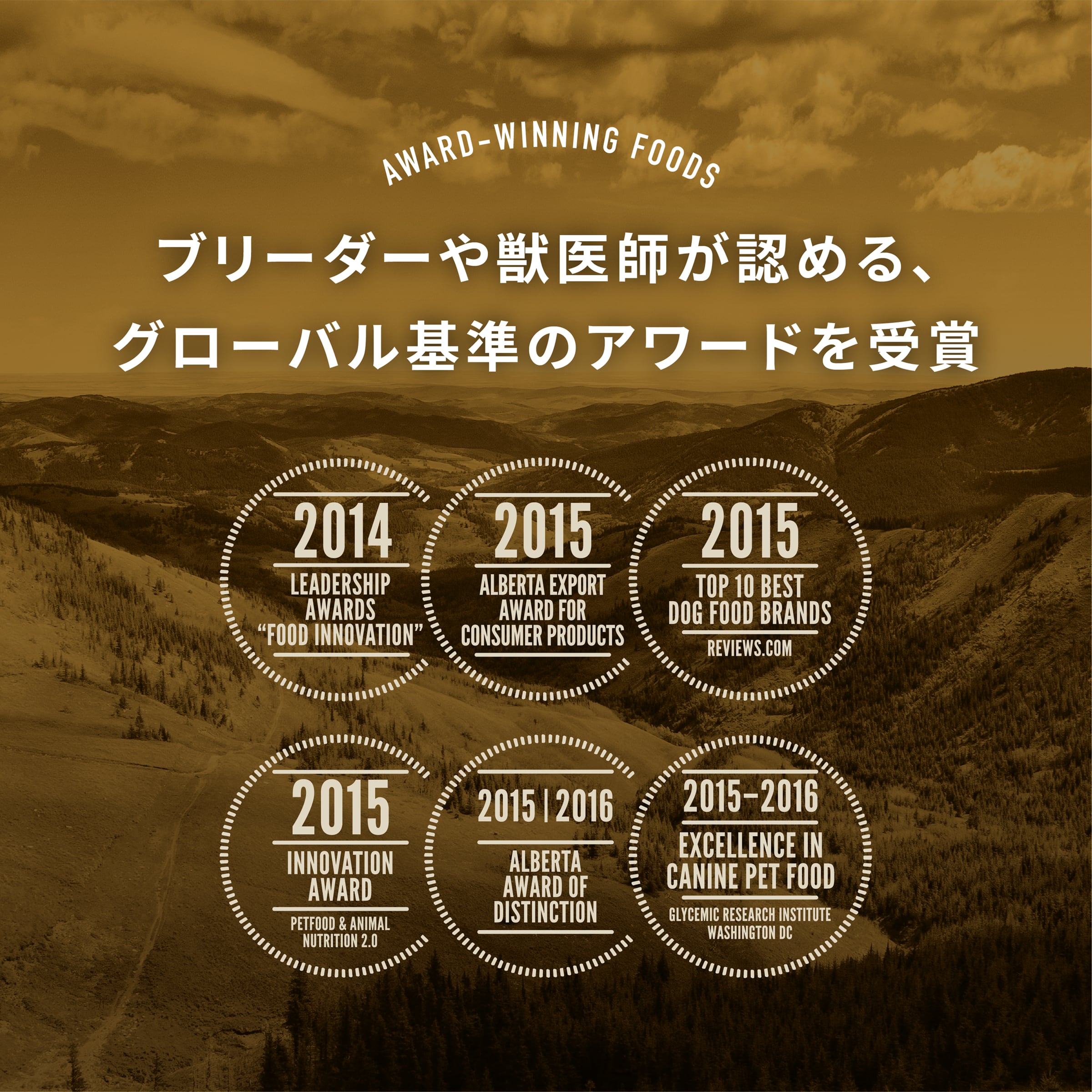 生の丸ごとイワシ (18%), 生の丸ごとサバ (11%), 生の丸ごとヘイク (10%), 生カレイ(6%), 生の丸ごとメバル (6%), 生の丸ごとシタビラメ (6%),ディハイドレートサバ (5%), ディハイドレートニシン (5%), ディハイドレート白身魚 (5%), ディハイドレートイワシ (5%), ディハイドレートアオギス (4%), ニシン油 (4%), 丸ごと赤レンズ豆, 丸ごとエンドウ豆, 丸ごとヒヨコ豆, 丸ごと緑レンズ豆, レンズ豆繊維, 丸ごとピント豆, エンドウ豆スターチ, ヒマワリ油, 乾燥ケルプ, 新鮮丸ごとカボチャ, 新鮮丸ごとバターナッツスクワッシュ, 新鮮丸ごとズッキーニ, 新鮮丸ごとニンジン, 新鮮丸ごとリンゴ, 新鮮丸ごと洋梨, 乾燥チコリールート, 新鮮ケール, 新鮮ホウレン草, 新鮮ビートの葉, 新鮮カブラ菜, 丸ごとクランベリー, 丸ごとブルーベリー, 丸ごとサスカトゥーンベリー, ターメリック, オオアザミ, ゴボウ, ラベンダー, マシュマロルート, ローズヒップ 酸化防止剤: 植物油から抽出したトコフェロール: 121mg, クエン酸: 40mg, ローズマリーエキス: 80mg 添加栄養素(1KGあたり): 3b606 (亜鉛: 75mg), 3b406 (銅: 11mg), 3a821 ビタミンB1: 9.8mg, 3a700 ビタミンE: 200 IU 添加腸球菌: 4b1707 エンテロコッカスフェシウム菌 NCIMB 10415 1x10^9 CFU