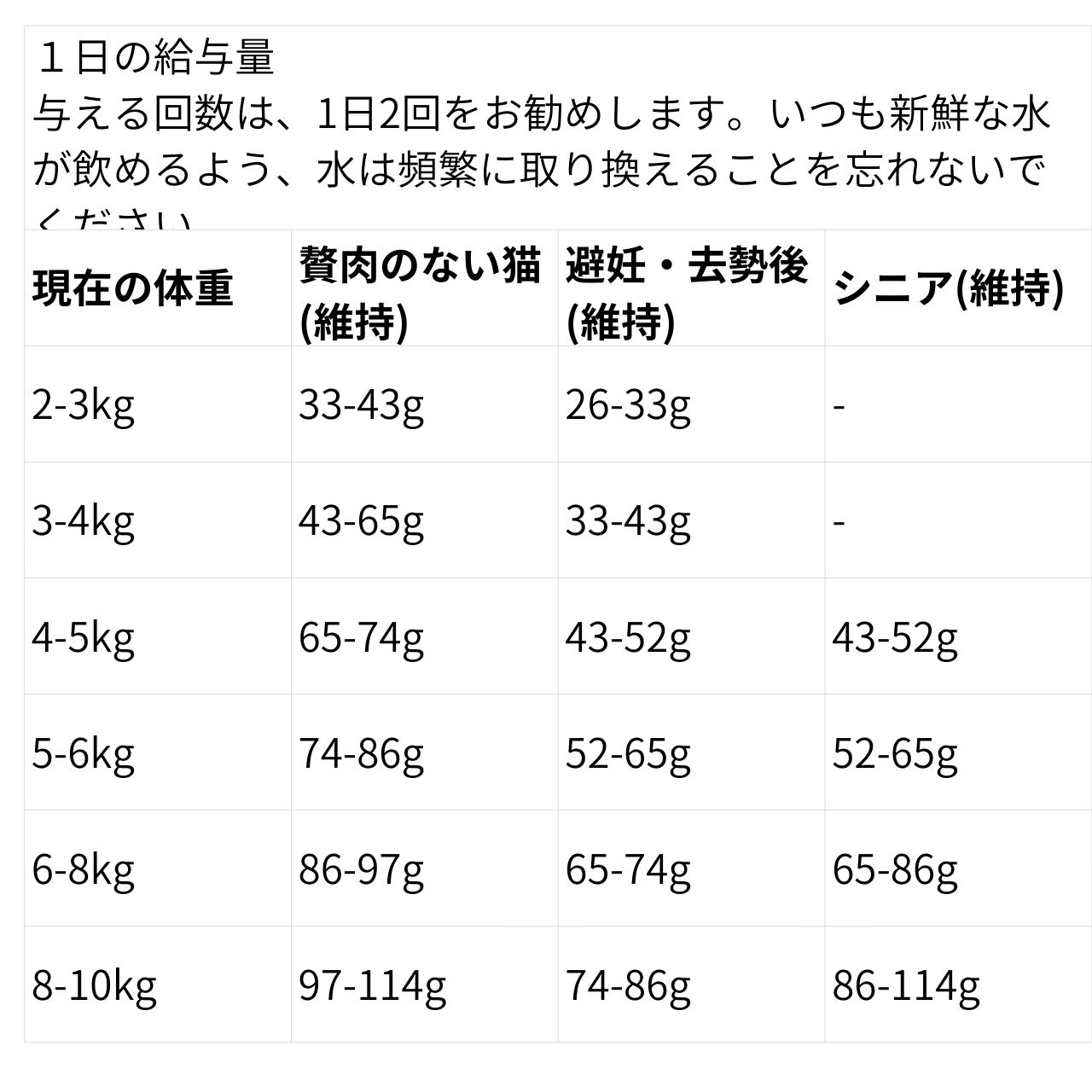 カルシウム 2.1%、リン 1.6%、マグネシウム 0.1%、タウリン 0.2%、オメガ6脂肪酸 2.5%、オメガ3脂肪酸 1.1%、DHA 0.25%、EPA 0.2% 代謝エネルギーは4100kcal/KGまたは250mlカップ1杯(130g)につき、533kcalです。