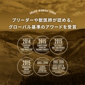 生牛肉 (11%), 生の丸ごとイワシ (11%), 生イノシシ肉 (5%), 生バイソン肉 (5%), 生ラム肉 (5%), 生豚肉 (5%), 生牛レバー (4%), 生豚レバー (4%), 新鮮卵 (4%), ディハイドレートラム肉 (4%), ディハイドレート牛肉 (4%), ディハイドレートニシン (4%), ディハイドレートイワシ (4%), ディハイドレートマトン肉 (4%), ディハイドレート豚肉 (4%), キャノーラ油, 丸ごと赤レンズ豆, 丸ごとエンドウ豆, 丸ごとヒヨコ豆, 丸ごと緑レンズ豆, エンドウ豆スターチ, 生ラムレバー (2%), ディハイドレート白身魚 (2%), ポロック油 (2%), 丸ごとピント豆, 丸ごと白インゲン豆, レンズ豆繊維, 生ラム腎臓 (0.5%), 生ラムトライプ (0.5%), 乾燥ケルプ, 新鮮丸ごとカボチャ, 新鮮丸ごとバターナッツスクワッシュ, 新鮮丸ごとズッキーニ, 新鮮丸ごとニンジン, 新鮮丸ごとリンゴ, 新鮮丸ごと洋梨, 乾燥チコリールート, 新鮮ケール, 新鮮ホウレン草, 新鮮ビートの葉, 新鮮カブラ菜, 丸ごとクランベリー, 丸ごとブルーベリー, 丸ごとサスカトゥーンベリー, ターメリック, オオアザミ, ゴボウ, ラベンダー, マシュマロルート, ローズヒップ 酸化防止剤: 植物油から抽出したトコフェロール: 121mg, クエン酸: 40mg, ローズマリーエキス: 80mg 添加栄養素 (1KGあたり): 3a890 塩化コリン (コリン): 1190mg, 3b606 (亜鉛: 105mg), 3b406 (銅: 11mg), 3a821 ビタミンB1: 12.5mg, 3a825i ビタミンB2: 10mg, 3a314 ビタミンB3: 50mg, 3a841 ビタミンB5: 8mg, 3a831 ビタミンB6: 6.5mg, 3a316 ビタミンB9: 0.75mg, 3a880 ビタミンB7: 0.13mg, ビタミンB12: 0.1mg, 3a710 ビタミンK3: 0.5mg, 3a672a ビタミンA: 3750 IU, 3a671 ビタミンD3: 500 IU, 3a700 ビタミンE: 290 IU, 3a300 ビタミンC: 12.5 IU 添加腸球菌: 4b1707 エンテロコッカスフェシウム菌 NCIMB 10415 1x10^9 CFU