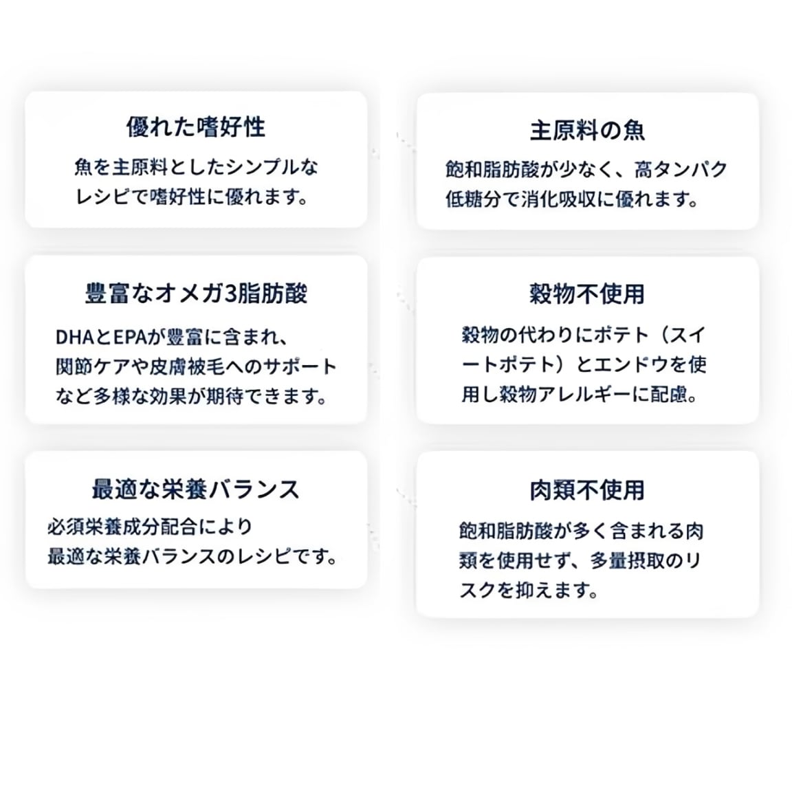 たんぱく質の供給源として新鮮な魚を使用し、魚由来のオメガ3およびオメガ6をバランスよく豊富に摂取することが可能です。