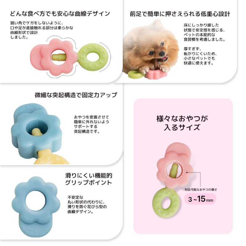 様々なサイズのおやつをすばやく簡単に固定できて、どんな食べ方でも安心できる曲線デザインです。