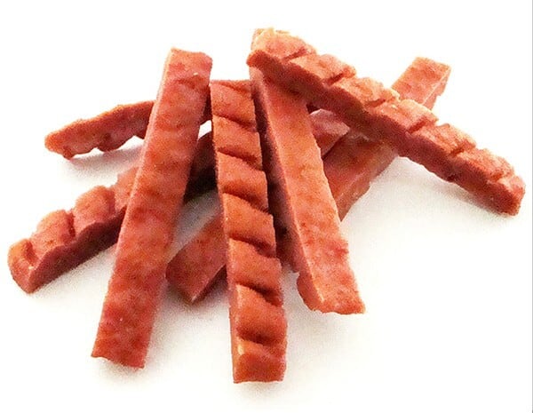 【素材】肉類(鶏肉、牛肉)、小麦澱粉、大豆たん白、砂糖、食塩、澱粉、ソルビトール、プロピレングリコール、ポリリン酸Na、着色料(赤102号、黄5号、赤106号、青1号)【成分】粗タンパク質22.0%以上、粗脂肪8.0%以上、粗繊維1.0%以下、粗灰分1.5%以下、水分28.0%以下【エネルギー】約334kcal/100g当たり